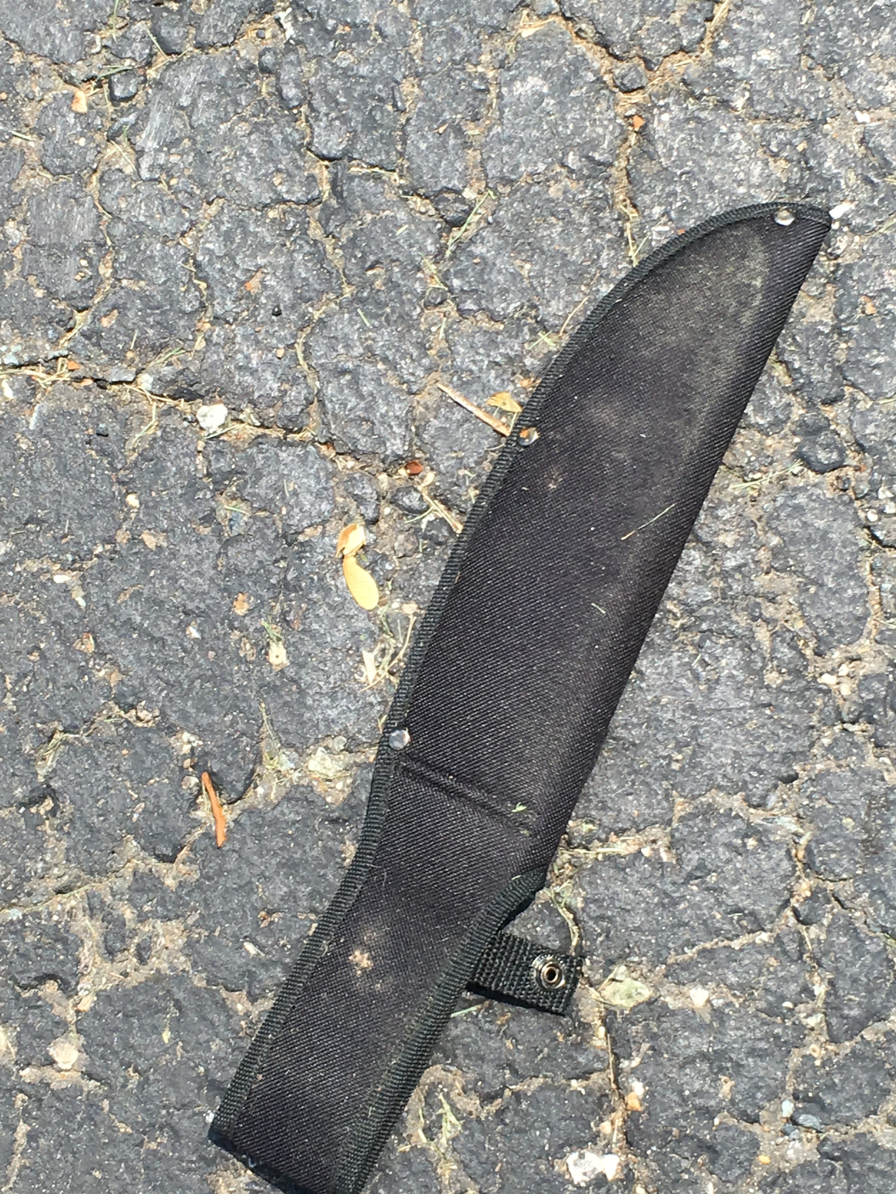 After riding up on this thing that I have lovingly called a machete case, I immediately looked up into the trees to see if I could spot Rambo, or the U.S. Army, or O. J. for any insight as to why such an item would be there at the edge of a corporate office parking lot. I saw nothing. I scanned the perimeter a second time and still saw nothing outside of the norm. If I were ever called in as an eye witness, the only thing I would be able to describe would be leaves and brick buildings.